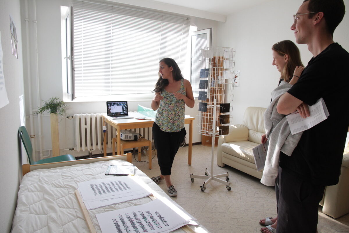 The Tiny Tour is a site-specific tour with real and fictitious facts about everything a space is and could be. Dressed as classic tour guides, our international team was guiding the participants in three available languages through a space that might seem insignificant or mundane at the first glance, but turned out to offer an unimagined potential. The group was exploring a microcosmos in a humorous way through matters of function, context and self-conception of the site, which led to new findings but also challenged the already known. The Tiny Tour was developed as a collective work of Vanessa Brazeau, Paloma Sanchez-Palencia and Lena Skrabs.