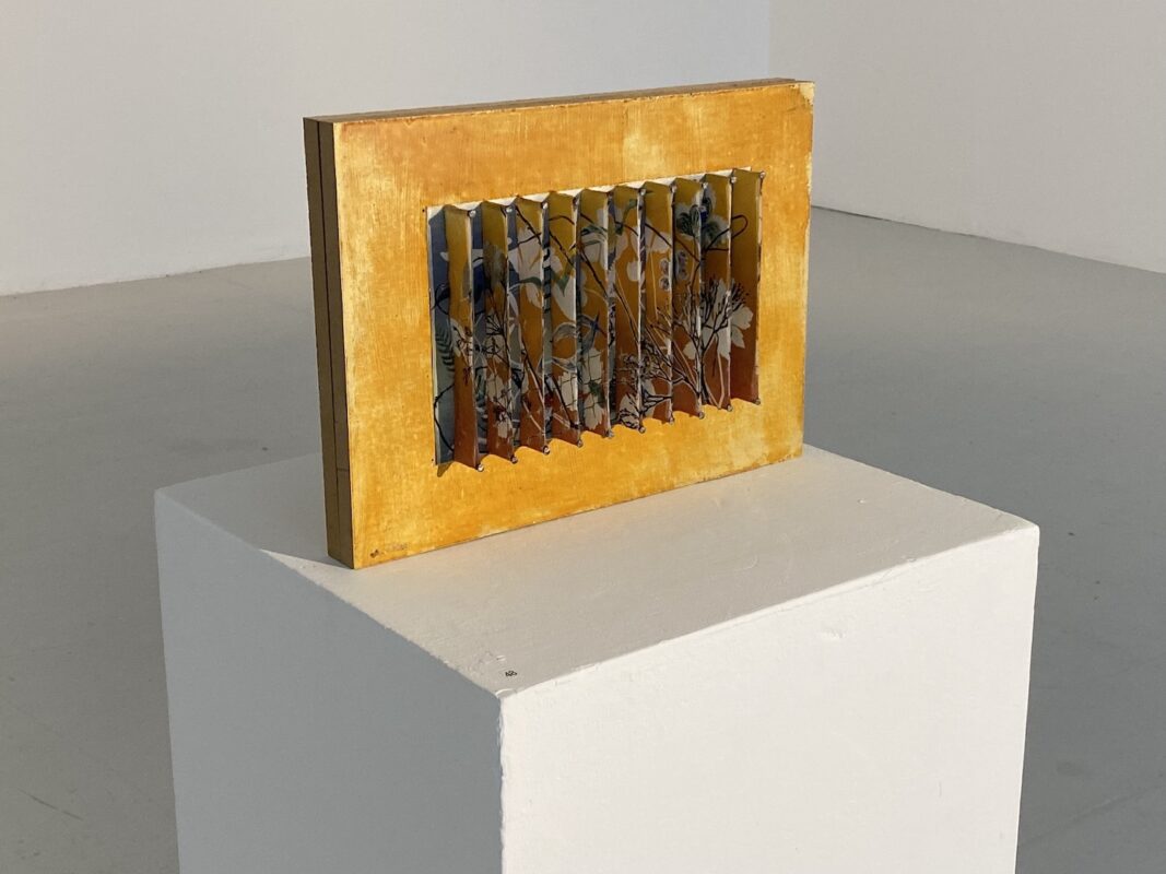 Working directly with plant fibres, inks and an array of fine-art papers Iris tries to re-create the wildness of nature in her collaged and relief works. The works have a touch of ‘Art Nouveau’ or 50‘s ‘Hermes’s-like’ floral style which can be seen across her silk, linen, wood, paper and glass pieces all decorated ornamentally with botanic imprints.