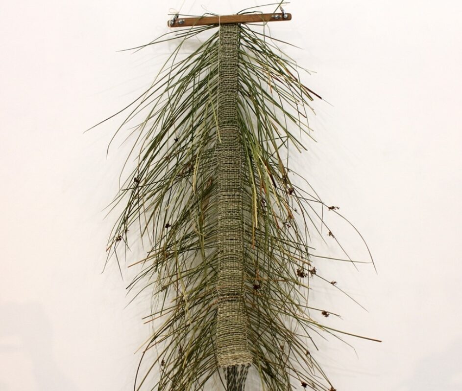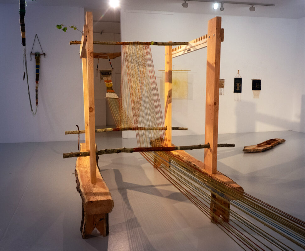 We arrived in Cluainin with very little in the way of works that could fill a space like the Leitrim Sculpture Centre, much less an exhibition by just one artist, or in our case, two. With only a small pack of our tools and instruments, some wools and colours from Sardinia, an island in Italy where we live and learn the art of weaving from our Maestro (who also gifted us a long roll of hand-woven cloth before leaving), along with a small collection of our past tapestries and our drop spindles, we began creating what you now see here — a show we call 'Meitheal', or The Social Fabric.