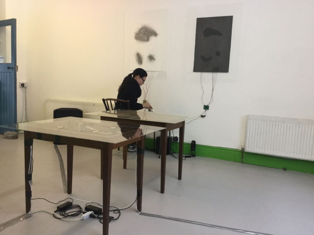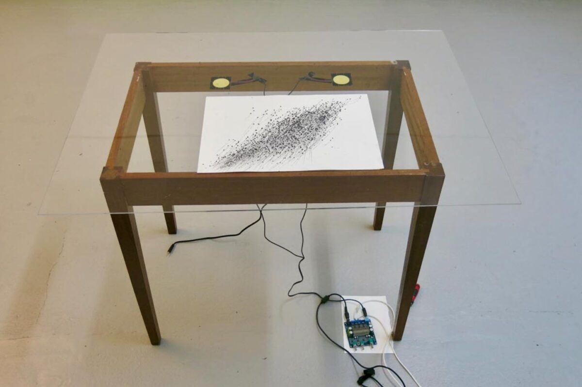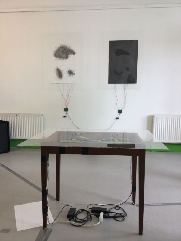 These two methods of Sonic Drawing are employed to encourage the participatory response of visitors to the installation space. The incidental sounds of participants drawing actions mingle with durational sounds that are generated live by custom electronics in concert with graphite drawings to create a space of responsive co-creation. Through this intervention, the activation of the exhibition space serves to influence the participants’ perception and interpretation of the sonic gesture.