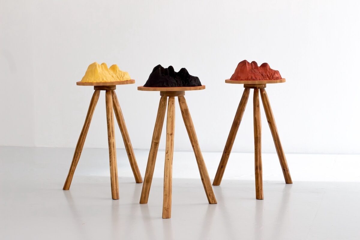 Cast pigmented jesmonite with gold, shungite and iron oxide on wooden plinths.The Mountains are inspired by geodata form of Iron Mountain, with additional minerals and imbued with healing pure pigments. Photo by John O'Hagan