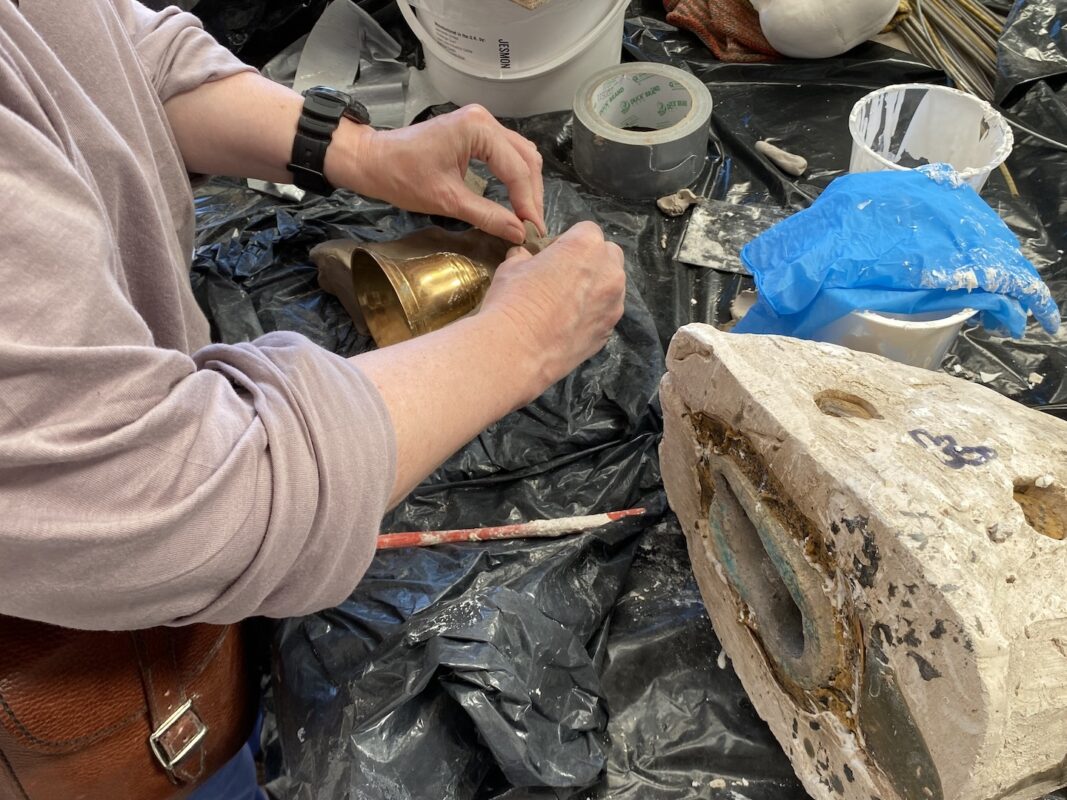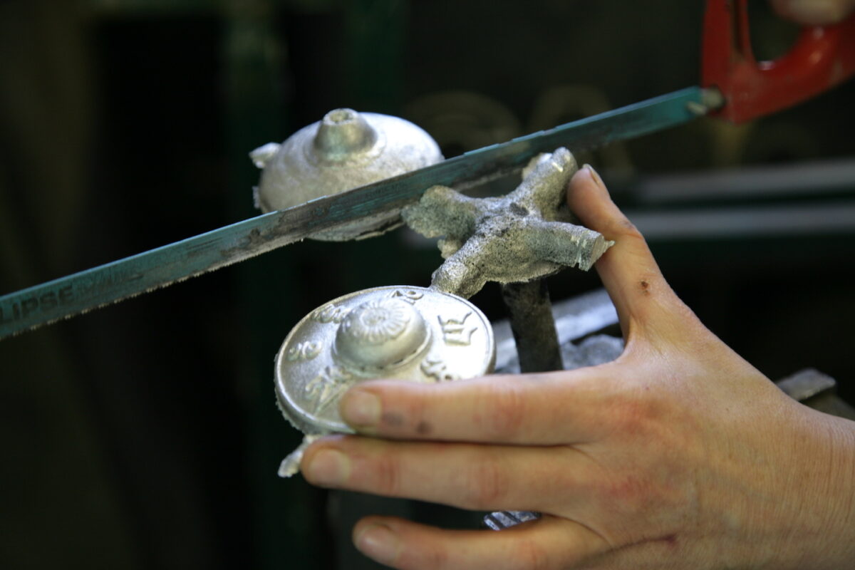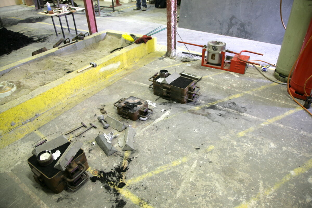 We then do an investment casting process: this involves a burn out of the resin from the mold. We then move into the foundry for the final day to pour hot metal into the mold void. When it's cooled the mold material is broken away to reveal the final cast metal object.